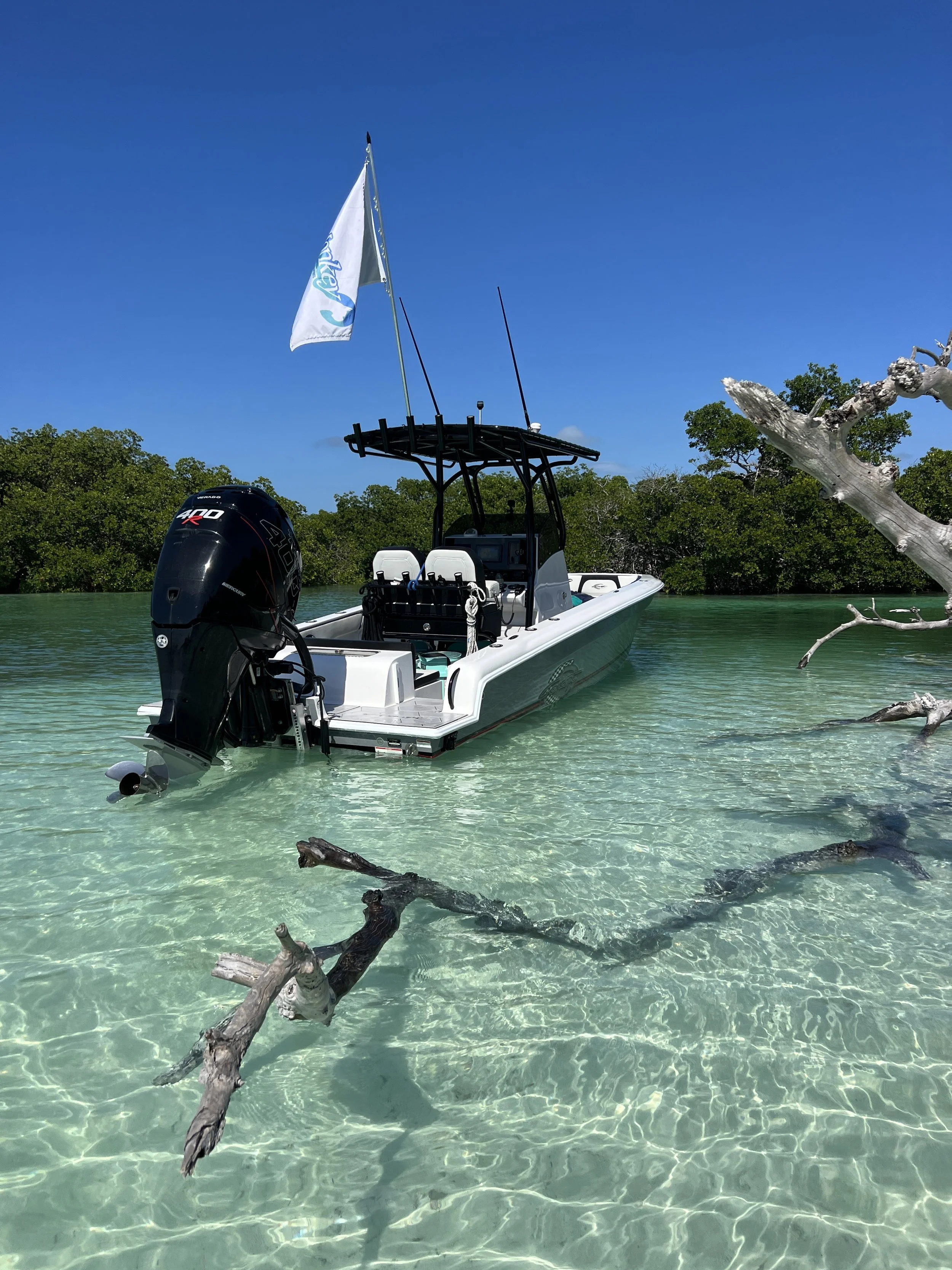 photo of a 23' Concept Center Console boat anchored in the shallows